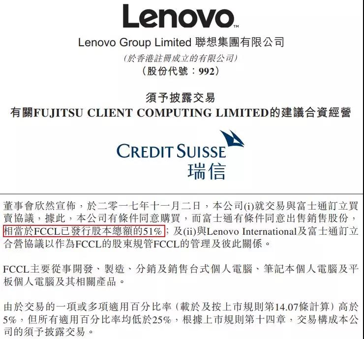 大环境已经如此,联想集团却在PC上继续投入:2017年11月2日,联想集团发布公告称,将以255亿日元(约合14.7亿元人民币)收购富士通全资附属公司富士通客户端计算设备有限公司(FCCL)51%股权,目前收购已完成。