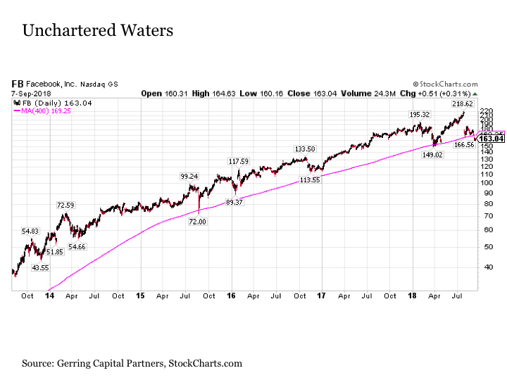 Facebook股价问题肇始于7月25日。在股价创历史新高的当天盘后,Facebook公布了令人失望的最新季度财报,股价随后暴跌超20%。暴跌过后,Facebook股价有所反弹,看似要拉开剑桥分析风格式的逆转,并能攀上新高。但是从现在的情况来看,公司股价可能要跟“FAANG”家族其他成员走上截然不同的走势,未来股价可能进一步下跌。