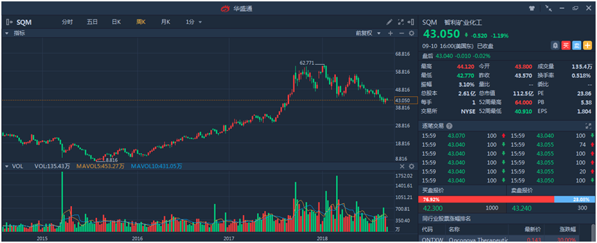 SQM智利矿业化工,全球锂矿龙头企业之一,是全球重要的锂矿资源开发者,是美股市场里著名的锂电池概念股,受到新能源汽车行业的发展,市场对于锂电池的需求日益提高,公司受益行业发展,从2017年以来股价涨幅达到65.77%。