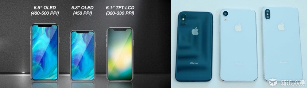 根据新浪众测获取的消息,今年Apple也将发布3款机型,其中两款为OLED屏幕,背部搭载双摄像头,还有一款为LCD屏幕,背部搭载单摄像头,同时3款手机的正面已经全部变为类似iPhone X的刘海屏。