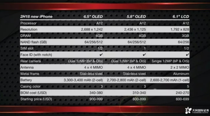被称为“最懂苹果的人”的天风国际证券分析师郭明錤,曝光了三款新iPhone的详细配置。和最早传闻的一样,6.1英寸LCD、5.8英寸和6.5英寸OLED版三款新iPhone均搭载A12处理器,而非6.1英寸版本iPhone搭载A10处理器。