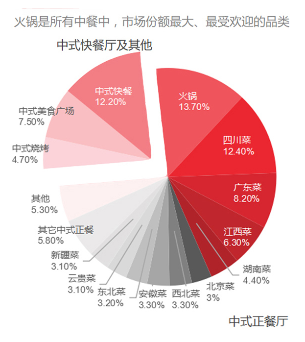 1、从整体市场来看,中国餐饮服务市场发展迅猛,过去五年和未来五年,都会有10%左右的复合增长率。在中式餐饮里,火锅则以13.7%的市场份额独占鳌头,成为国人外出就餐最受欢迎的选择。火锅的可扩张性和标准化的独特业务模式,决定着海底捞拥有更长远的增长潜力。