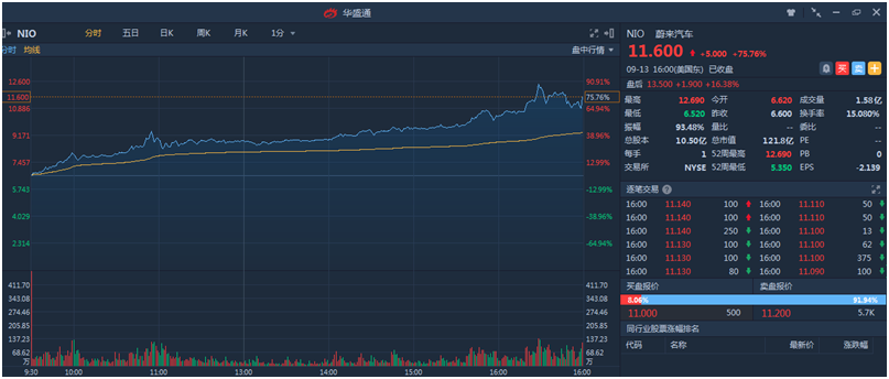 昨晚蔚来汽车在经历了上市首日破发后回升,终于在第二天大涨75.76%,股价最高达到12.69美元,市值成功超过100亿美元大关。