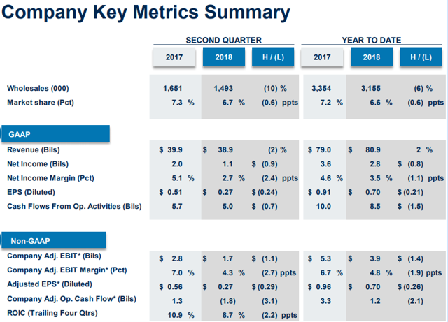 在第二季度的财报中,如下图所示,福特的收益为每股27美分,低于分析师此前预期的31美分。更大的问题在于,福特在2018年第二季度利润为10.7亿美元,而去年同期为20.5亿美元,同比下降50%,管理层将2018年EPS预期下调到1.30-1.50美元。
