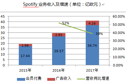作为全球著名的流媒体音乐平台Spotify,直接受益于行业风向发展利好,呈现出强劲的成长性。通过会员付费订阅和广告收入作为商业变现模式,公司营业收入保持快速增长。