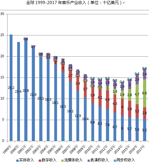 其实自1999年之后,全球音乐产业就呈现疲弱趋势,在经历了长达15年的产业收入下滑之后,从2015年起行业开始复苏,连续三年实现增长,其中起到关键驱动作用的正是流媒体音乐。