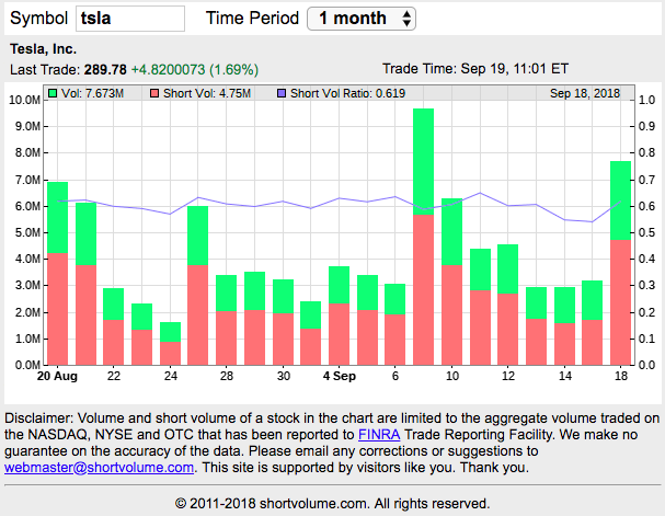 另一方面,从交易量上看,最近一月的多数成交是卖空方向的,如下图所示。所以综合来看,特斯拉股价目前处于下行压力,但如果特斯拉能够提高产量、实现盈利,这未必不是多头的投资机会。