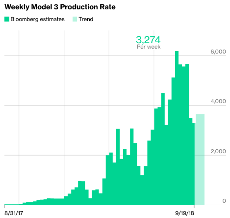 根据彭博数据,特斯拉8月中旬实现了周产6000辆Model 3的目标,如下图所示,从下图也可以看到,特斯拉的生产规律是增产、调整、维持和重复,先通过增产措施找到最有产能,维持一段时间,下一步再尝试提高产能。所以,下一步特斯拉可能尝试周产7000的产能提高,以达成4季度的目标。