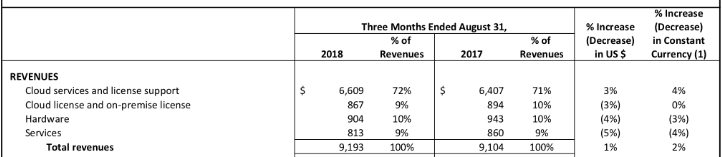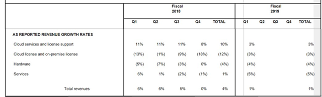 财报显示Q1营收为92亿美元,比分析师预期低了1.2亿美元,为15年年中以来的最大不及预期,营收增速1%为16年以来最低,不计汇率影响则同比增长2%,各分部营收占比维持稳定,只有云服务及授权支持分部保持正增长。云授权及本地授权业务持平,而传统的硬件及服务分部均有个位数的下滑。