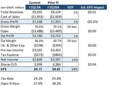季度调整后EPS为0.71美元,同比增长18%,比分析师的一致预期0.69美元要高2美分,超预期其实归功于降税、股票回购及汇率变动的正面影响,季度税率由去年同期的25%降至19.1%,Q1单个季度就花了约100亿美元来回购股份,导致流通股减少了2.85亿股,另外分析师预计汇率变动带来EPS 3美分的损失,而实际负面影响低于预期,只带来1美分的拖累。因成本提升,毛利率从去年的79.1%稍微下滑至78.8%。综合而言,实际上调整后的盈利是不及预期的。