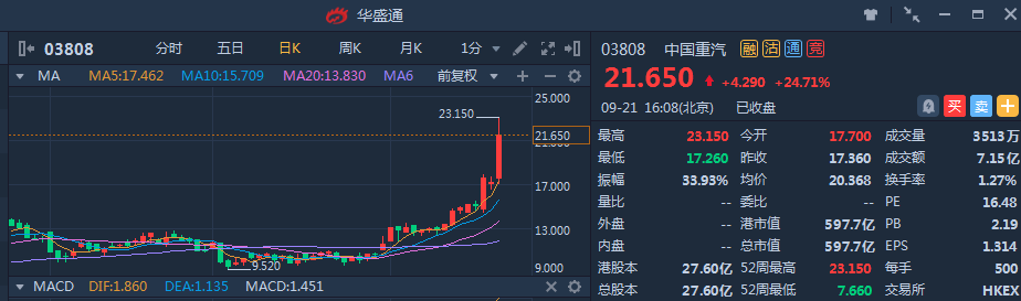 截至2017年12月31日止之全年业绩为营业额上升68.3%至554.58亿元人民币,税后盈利30.23亿元人民币,大幅增长4.7倍。期内整体毛利率上升0.4个百分点至18.1%。而2018年6月30日止之半年度业绩为营业额337.24亿元人民币,增长26.3%,股东应佔盈利上升68.9%至23.65亿元人民币。可于现价21.65元附近买入,中长线可见30元,跌穿19.30元止蚀。