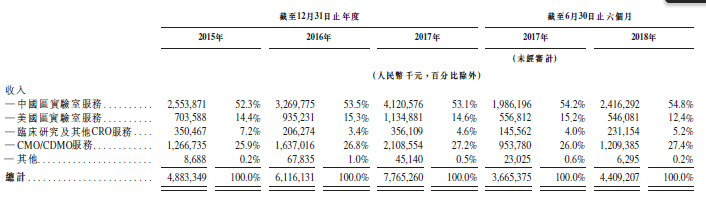 公司主营业务包括合同研发服务(CRO)及合同生产/合同生产研发业务(CMO/CDMO),覆盖小分子药物、细胞疗法及基因疗法的研发生产服务,同时提供医疗器械检测服务。按业务分部划分,收入主要来源于中国区实验室服务及CMO/CDMO服务,按地区分美国是公司收入的最主要来源之一,17年占总收入比例达到57.48%,中国及欧洲地区是两大重要增长区域。