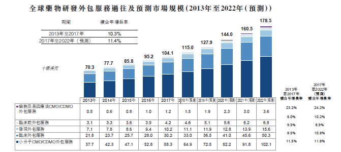 因药物研发过程漫长复杂,且成本高昂附带风险,制药公司纷纷选择药研开发一站式服务平台,全球制药市场外包研发开支比例将持续上升,弗若斯特沙利文报告预计全球药研外包市场规模将从17年的1041亿美元增至2022年的1785亿美元,复合年增长率为11.4%,其中细胞及基因疗法、小分子CMO/CDMO外包服务增速最快。