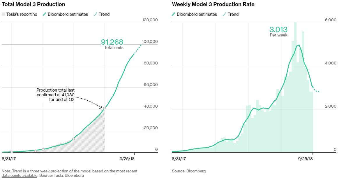 预测Model 3产量最出色的可能是彭博的Model 3追踪数据,如下图,基于已注册或市场上出现的VIN(车辆识别码)来进行预测,此前这种模型曾经备受争议,18财年Q2及Q3季中对产能相当乐观,但到季末数据开始下滑;上周彭博对模型做了大的变动,结果是累计产量预期下滑了4.4%,跟Q2情况一样,要是看几周前的数据,对产能预期可能会相当乐观,一度升至6.5万辆以上,不过之后大幅下滑。
