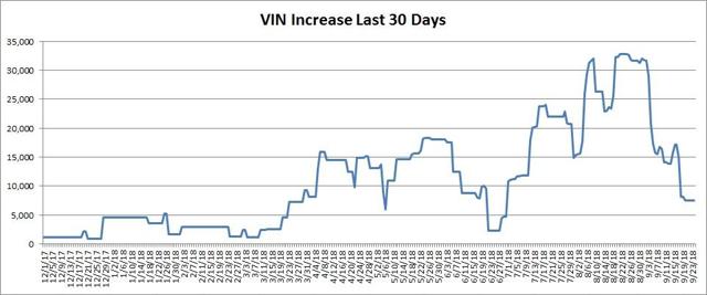 笔者也基于注册VIN的长期变动搭建了模型来预测产量,主要根据30天滚动VIN变动,考虑到工厂维护及停产后确定的12周生产时长。如下表,同Q2类似季末VIN跌至较低水平。假设季末没有新增VIN,那么模型得出的产量预计为55840辆,接近产量指引的高位,比彭博的预期要高一些,且随着新增VIN对应数值会更高。值得注意的一点是,近期新增VIN较低意味着Q4期初开始的产量很可能较低。