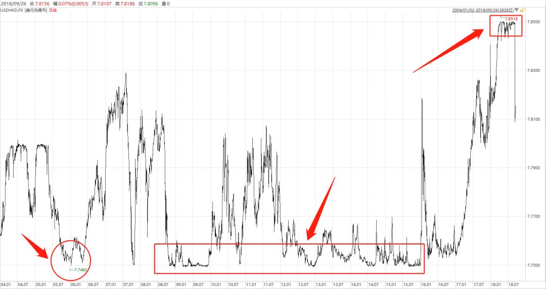 港币一直以来与美元挂钩,汇率在7.75到7.85之间窄幅波动。