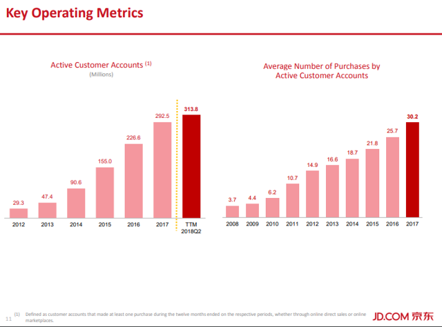 3、京东一直在扩大市场份额(活跃的客户账户数量,购买的平均数量一直在增加,总收入也在增加)。活跃客户账户的总数从2012年的2930万增加到去年的29250万。目前,最近一年(TTM)的活跃客户账户总数预计为31380万,相比2017年增长7.3%,如下图所示。此外,京东的营收也在持续增长。