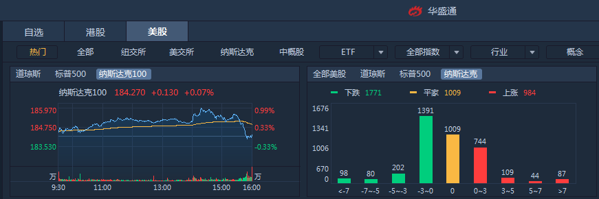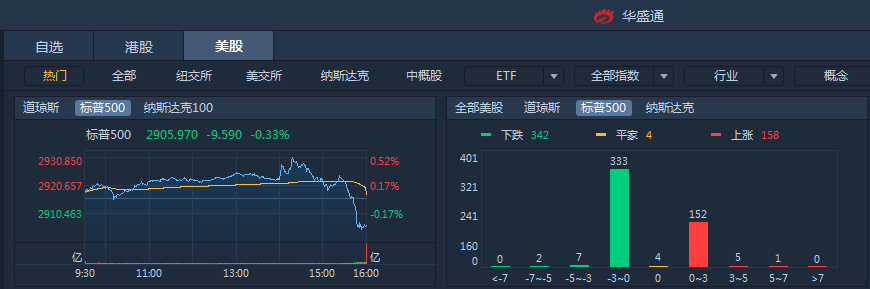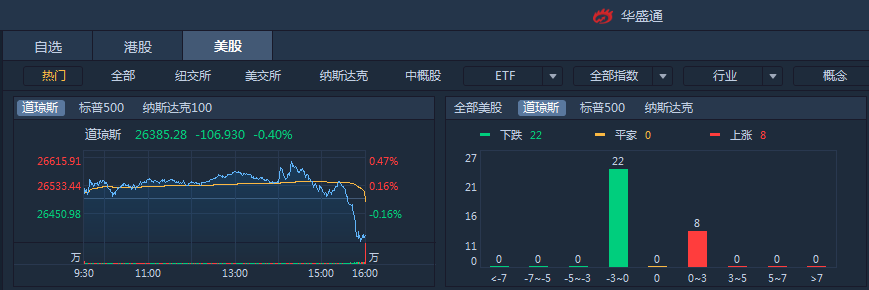 美联储如期加息,周三美股短线上涨后回落,三大指数均收跌,道指跌幅0.40%,标普收跌0.33%,纳指下跌0.21%。