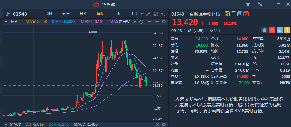 曾经被寄予厚望,三年内从1块多升至最高34块的医药创新明星股金斯瑞生物科技(1548.HK),昨天被不知名机构阎火研究做空,盘中最多跌45%,最后收跌26.79%。