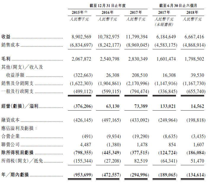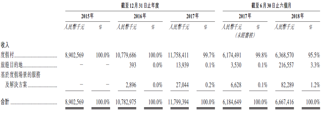截至2015-2017年12月31日止年度,收入分别为89.03亿元人民币(下同)、107.83亿元、117.99亿元,毛利分别为20.68亿元、25.4亿元、28.3亿元人民币,经调整EBIDTA分别为1.82亿元、6.57亿元、9.02亿元人民币。其中度假村业务收入分别占总收入的100%、100%、99.7%,贡献了绝大部分的收入,而随着项目的进展,旅游目的地业务及基于度假场景的服务及解决方案收入占比不断增加,2018年上半年占比分别为3.3%、1.2%。