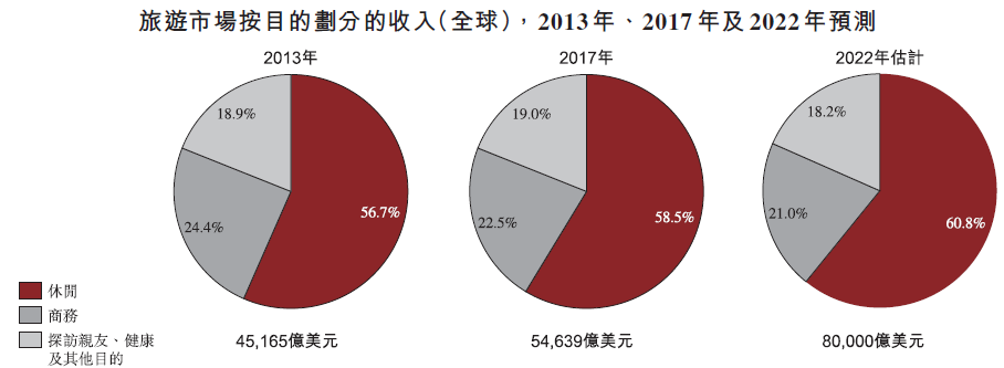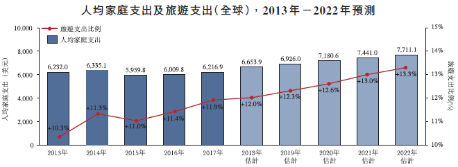 全球经济正在缓慢复苏,预计2017年至2022年全球名义国内生产总值将按6.3%的年复合增长率增长,于2022年达到108.5万亿美元,而随着全球经济的增长,全球人均家庭支出同样持续增长,而在旅游支出方面,根据世界旅行及旅游理事会的资料,2017年的全球人均旅游支出达到740.8美元,自2016年起的增长率为8.5%,并预期于2022年达到1025.1美元。