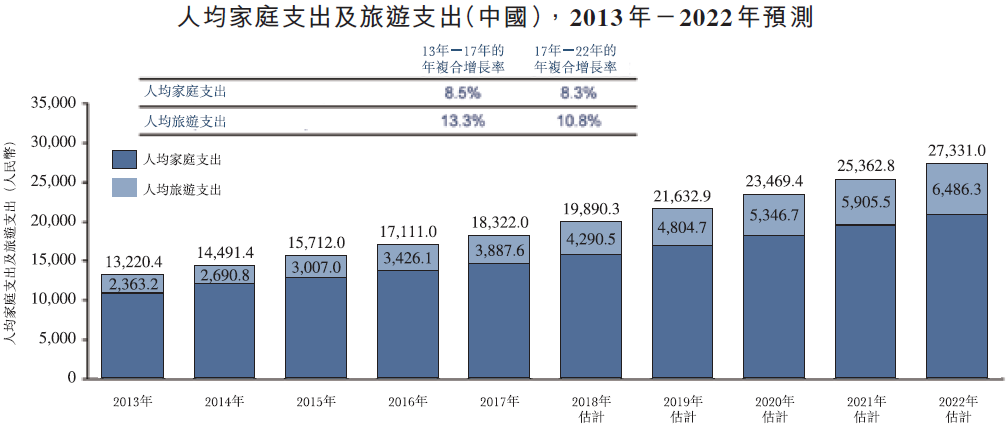 而中国经济同样在稳健增长,随着居民收入的增加,居民在文化旅游服务方面的消费也在不断增加,中国的人均旅游支出由2013年的2363.2元人民币增加至2017年的3887.6元,年复合增长率为13.3%,并占2017年人均家庭总支出的21.2%。预计2017年至2022年的年复合增长率将达到10.8%,超过人均家庭支出的增速。