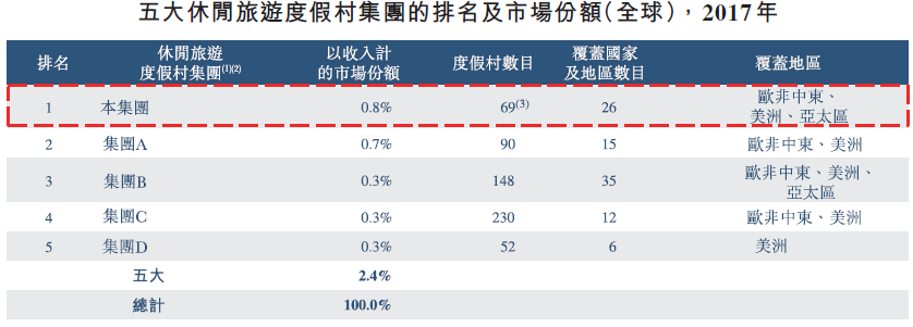 在休闲旅游度假村市场,公司市场份额排名位列全球第一,以2017年的收入合计占0.8%的市场份额,而前五大参与者共占比为2.4%。截至2018年6月30日,公司在全球26个国家及地区经营69个度假村。