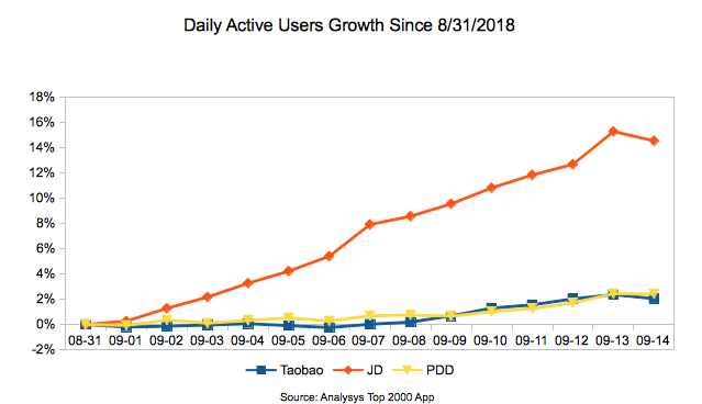 来自Analysys的数据显示,强东8月底被捕后的两周,公司的平台日活飙升14%,与同期的拼多多及阿里巴巴平台差异明显,其中的原因无法证实,不管猜想如何,至少平台流量并没有因该起事件而下滑。
