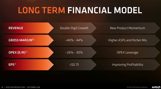 所以,只需要有限程度的市场份额增长,AMD就可在2020年达到年收入100亿美元的目标。参考目前毛利率和运营利润率计算,2020年AMD的毛利润为45亿美元,运营利润18亿美元。AMD长期EPS目标是“>0.75美元”,“>”号说明AMD从未打算将0.75美元作为最终目标,暗示投资者不要只关注过去的有限盈利水平。