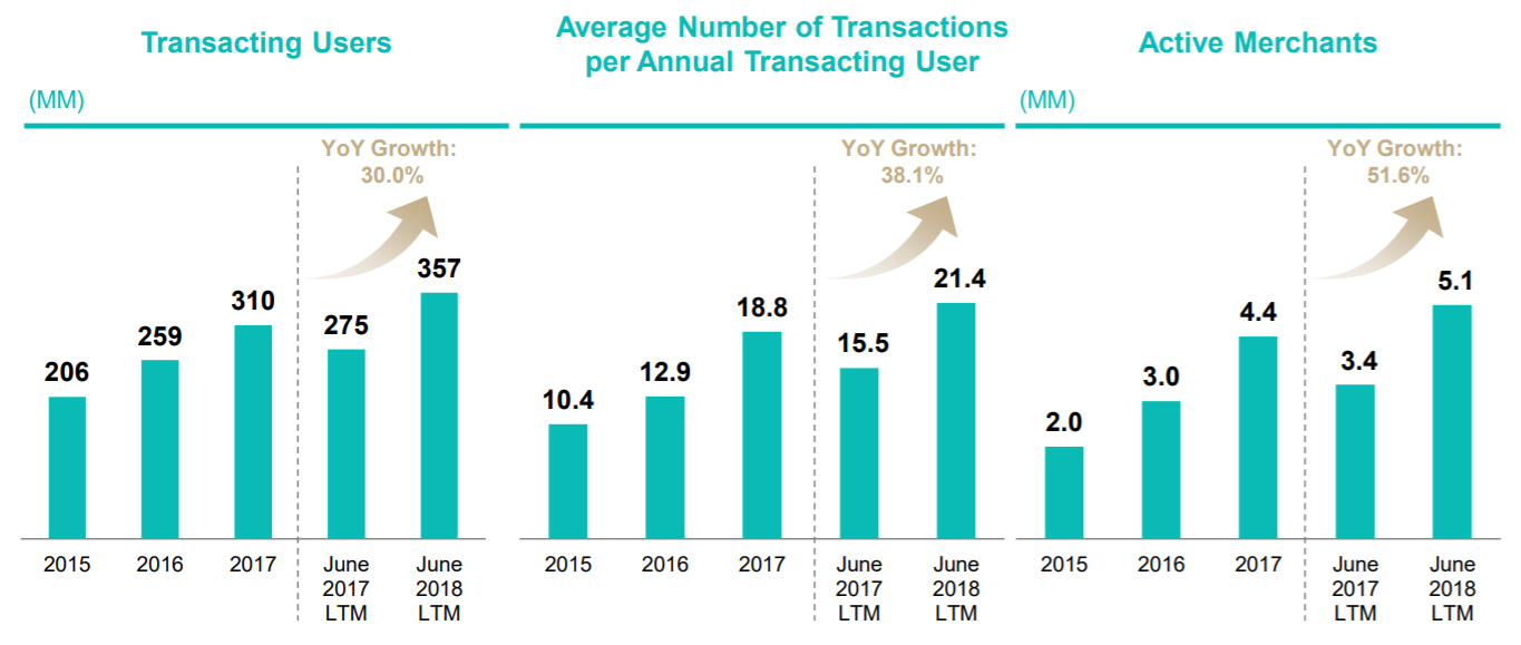 1、交易用户增长提速,活跃商家数达510万家。运营数据方面,交易用户上升至3.57亿人(LTM),同比增长30%。人均年交易笔数21.4笔,同比增长38.1%。活跃商家数达到510万,同比增长51.6%。相较于2018年前四个月的增速,活跃商家数基本持平,交易用户增速提升4 pcts,人均年交易笔数下降3 pcts。