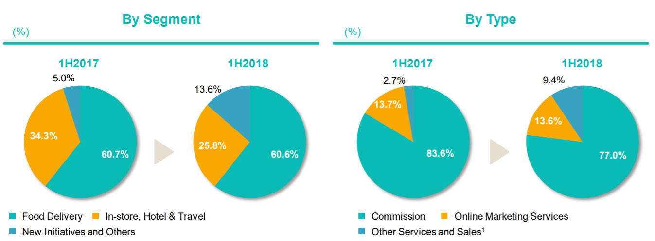 2、收入延续高增长,新业务增速进一步加快。2018H1美团点评总收入263亿元(+91.2%),较2018年前四个月94.9%的增速略有下滑。分布看,餐饮外卖业务员增速由108%下降至91%;到店酒旅业务增速由43%提升至44%;新业务增速由326%提升至419%。按类型划分的话,佣金、在线营销服务、其他服务及销售的收入占比由2018年前四个月的80%、13%、7%变为77%、14%、9%。
