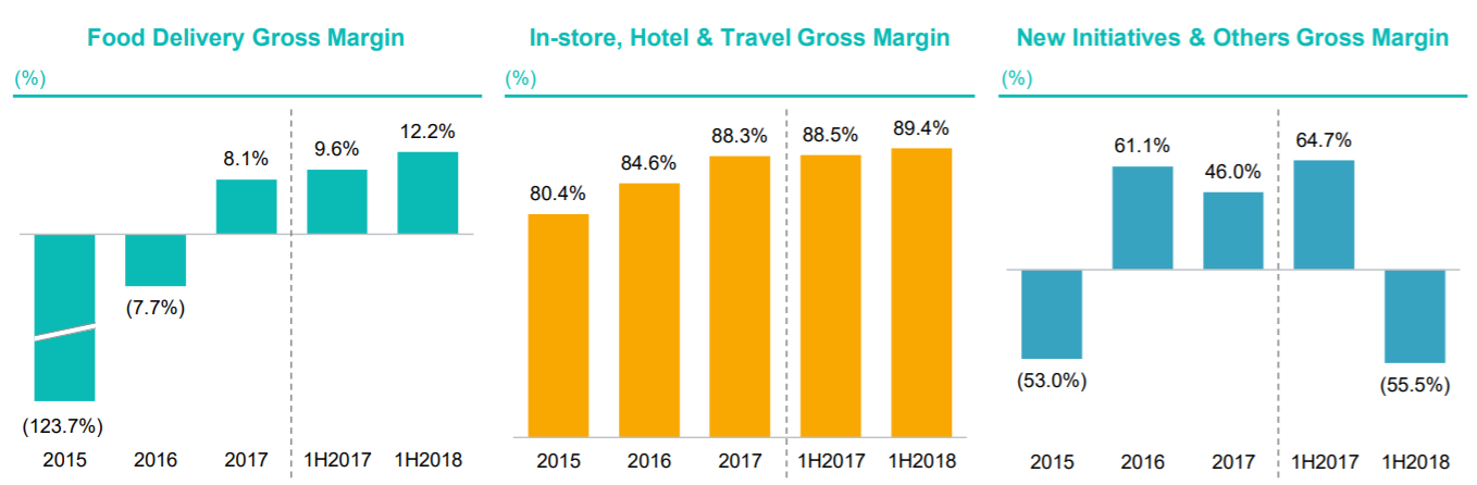 3、餐饮外卖业务毛利率大增2.6 pcts,新业务投入拖累整体毛利。毛利总额61亿元(+11%),主要受新业务分部-20亿毛利拖累,整体毛利率由2017H1的39%下降至2018H1的23%。而餐饮外卖、到店酒旅分部毛利分别达到19亿(+142%)和61亿(+46%),毛利率分别上升2.6和0.9 pcts。