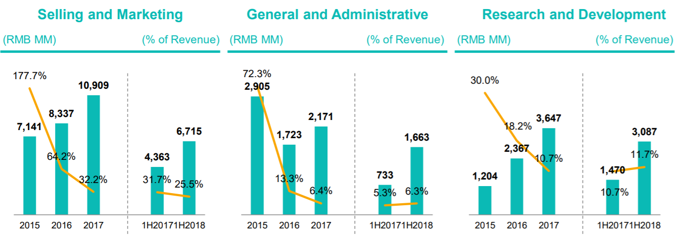 4、销售及营销开支较2017H1下降7 pcts,但相较于2018年前四个月数据,三费均有较大提升。销售及营销开支 、研发开支、一般及行政开支占比由2017H1的32%、11%、5%变为2018H1的25%、12%、6%,可见销售及营销开支因规模效应降幅较快。但是相较于2018年前四个月的16%、7%、4%,三费又均有较大提升,可能是上市前的费用调整所致。