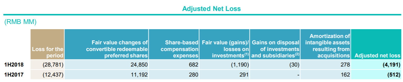 5、经调整亏损净额则为-42亿元,占比由2017H1的-4%提升至-8%。2018H1的经营利润为-39亿元(vs 2017H1 -12.5亿元),经营亏损率由-9%提升至-15%。受可转换可赎回优先股之公允价值变动 -249亿影响,期内亏损达到-289亿元。经调整亏损净额则为-42亿元(vs 2017H1 -5亿元),亏损额占营收16%(vs 2017H1 -4%),离盈利似乎又远了一步。