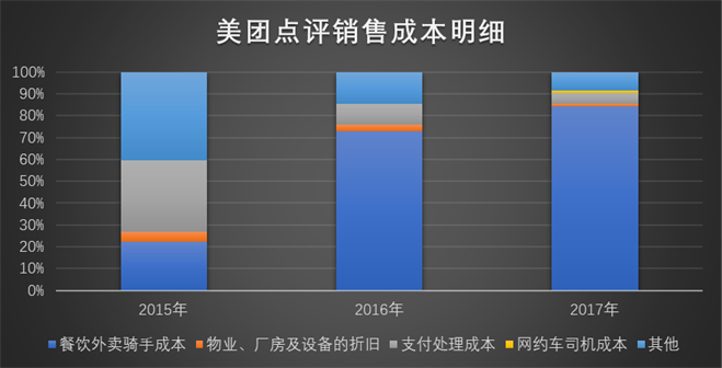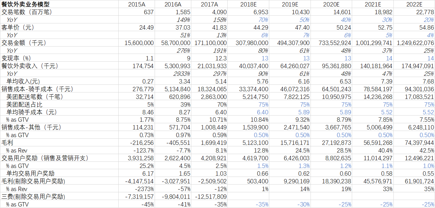 需要注意的是,虽然美团在招股书中披露的2015-2017年的外卖交易笔数,但自有配送网络所承担的外卖笔数只披露了2017年的,所以2015-2016年的数据只能通过活跃骑手数和效率改善情况作估算。