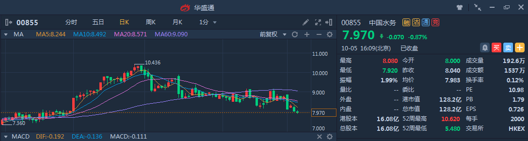 为配合城镇化的健康发展,对国内供水设施之升级改造或扩大规模,都有刚烈的需求,集团积极通过投资、营运和拥有 TOO 的拓展模式。努力跟各地政府合作,以提升城市内之供水服务水平。同时,透过水资源开发、供水系统、污水处理及水利工程等,建立一个全面日前覆盖的产业链。随著「十三五」规划落实,加快发展城镇及城鄕之供水及污水处理项目,定可带动业务稳定增长。可于现价 7.97元附近买入,中长线可见11.30元,跌穿7.10元止蚀。