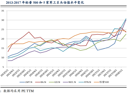 所以,根据统计,2013-2017年5大军工企业每股收益平均复合增速为7.26%;而其滚动PE从2013年初的10倍到2017年底增长到23倍,增幅达到130%,远超过标普500平均PE的50%增幅。