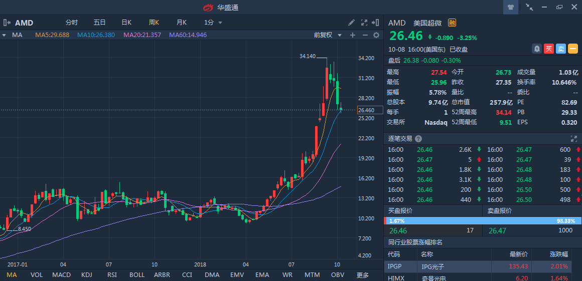 18年半导体行业中的美光科技(MU)及AMD(AMD)表现差异明显,两家公司最近期财报业绩都超预期,且都下调了未来展望,但股价走势分化严重,如下图,美光在Q2财报公布后下滑15%,而AMD则上涨超过70%,以下带来两家公司的对比分析。