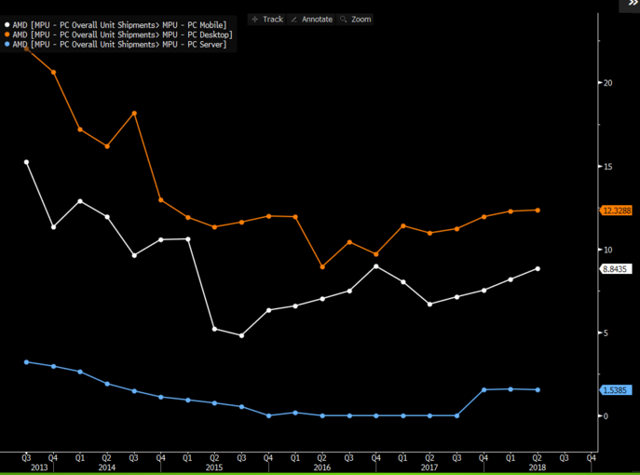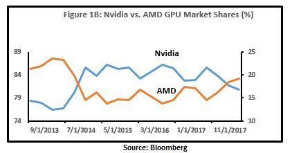 另一方面,如下图,显卡市场上公司近几个季度从英伟达(NVDA)手中夺取不少市场份额。