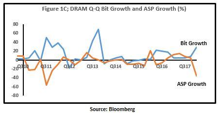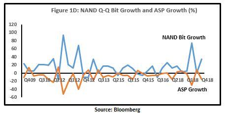 对于美光,市场的担忧包括内存需求与供应的不平衡,不管是DRAM还是NAND存储售价均受到不利影响,下图是两类产品的售价变动,预计英特尔CPU短缺带来的内存供应过剩及贸易战的影响将会持续到19年上半年。综合考虑定价下滑及成本缩减,19年DRAM及NAND行业增速可能低于18年。