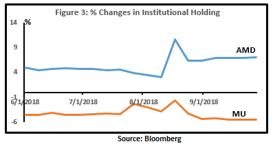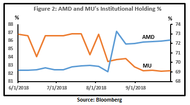近几个月,AMD发布超预期Q2财报后机构持仓增加了4%,而美光则是在财报后同样期间机构持仓持续减少了约4%。不仅如此,分析师还从多个角度看好AMD,上调公司的目标价。相比之下,市场对美光的财报反应并不佳,表示此前认为的DRAM需求下滑终于在18年Q4开始显现,9月份公司下调营收展望,且Barid将公司从顶级半导体大盘股的组合中移除,目标价从100美元下调至75美元,之后股票遭到抛售。晶圆代工大厂联电 (UMC)对美光的胜诉引发的潜在禁令暴露了公司在中美贸易纠纷方面的弱点。