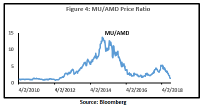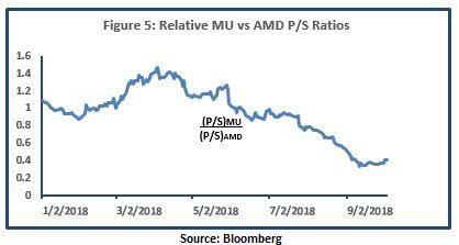 两家公司基本面都比较积极,只不过未来展望差异较大。估值上,根据两家公司股价的相对比值及相对P/S比值,可以看出美光折价高达40%至50%,且从14年四月开始,当前股价与AMD股价的比值为最低水平。从P/S相对比例看,18年四月后美光相对AMD有50%至60%的折价。