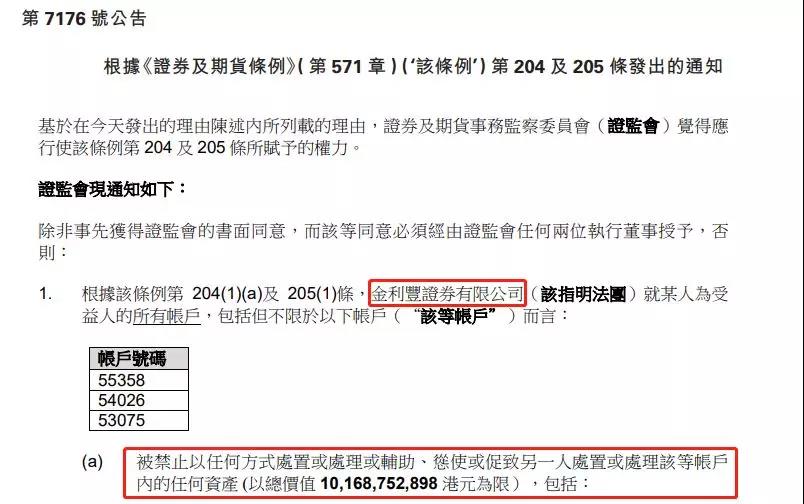 2018年9月17日,香港证监会冻结金利丰证券、中南金融及汇丰金融证券(亚洲)个别客户资产,停止有关账户的所有交易,上限为102亿港元,为港股史上最大冻资规模。原因在于有关人士串谋某上市公司的管理层人员策划欺诈性计划,令该上市公司蒙受合共约102亿港元的损失。