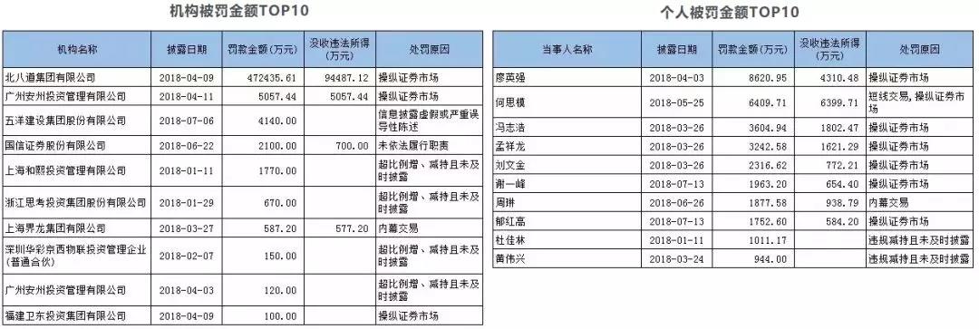 而在被处罚的机构中,出现了中国证监会史上最大罚单。北八道集团有限公司由于操纵市场行为,累计获利人民币9.45亿元,因此共被罚没56亿元。