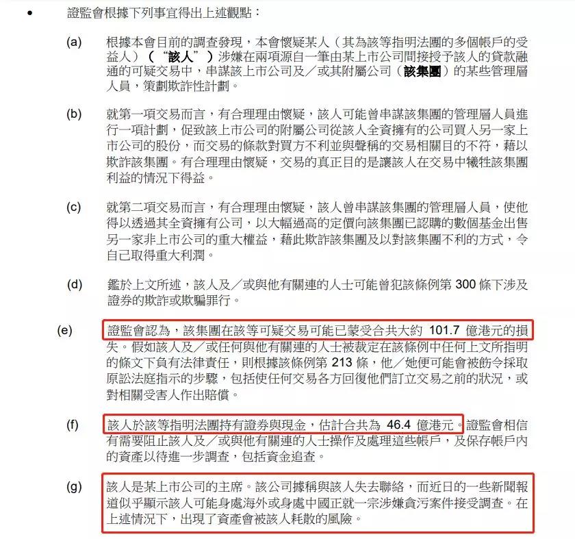 证监会更提到,主角为某上市公司的主席,该公司据称与该人失去联络,而近日一些新闻报道似乎显示该人可能身处海外或身处中国正就一宗涉嫌贪污案接受调查。因此,在上述情况下,出现了资产会被该人耗散的风险,于是有需要冻结资产以待进一步调查。