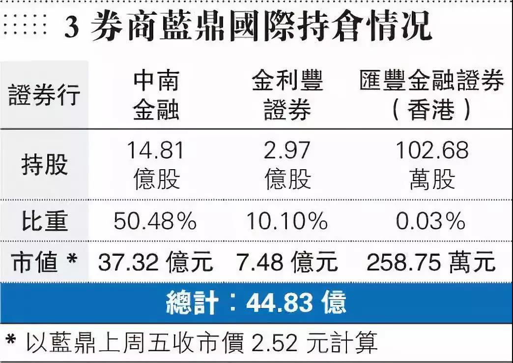 据中央结算系统显示,3家证券行持有的蓝鼎证券约120亿股,占蓝鼎总股本约60%,市值约45亿港元。不过,根据披露,仰智慧持有蓝鼎只约14.82亿股或50.48%。