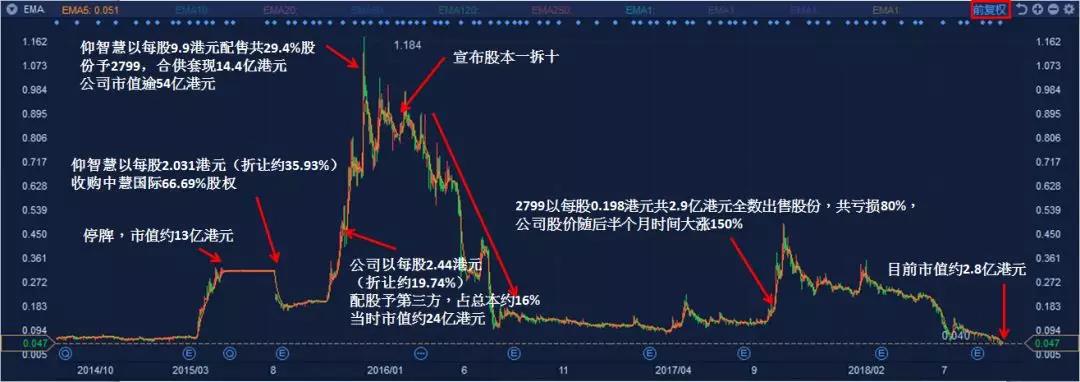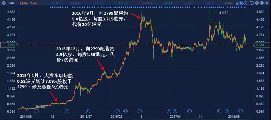 直至2015年12月29日,亦是公司股价处于最高水平之时,仰智慧以每股9.9港元(比当天股价折让约10%,但留意是在股价于配股当天于一天内暴升64%后才折让10%)配售共29.4%股份予2799及其旗下基金,合供套现14.4亿港元。