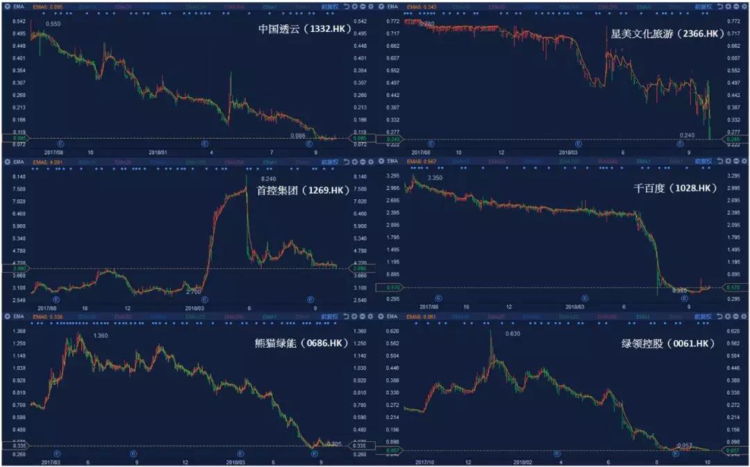 在上述股票中,有些在停牌,如明发集团(0846.HK)和汇力资源(1303.HK);有些曾经历不寻常的暴跌,如鼎亿集团(0508.HK,于2017年9月7日一度暴跌逾75%)、千百度(1028.HK,于2018年7月24日一度暴跌近70%)、民众金融科技(0279.HK,2个月升逾3倍,其后4个月跌去95%)。