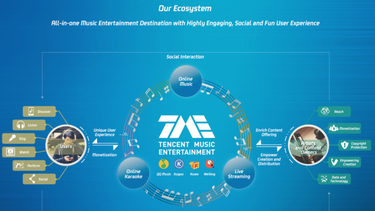 截至2018年6月30日,腾讯拥有来自200多家国内和国际音乐唱片公司(索尼、环球、华纳、英皇、中国唱片集团等等)的超过2000万首歌曲的最大音乐内容库。腾讯音乐还提供广泛的视频内容,如音乐视频、现场和录制的音乐会和音乐节目。此外,数以亿计的用户在平台上分享了他们的歌唱、短片、音乐表演的现场直播、评论和与音乐相关的文章。可见,腾讯音乐早已不满足于音乐流媒体的定位,而是向打造音乐泛娱乐生态的目标在前进。
