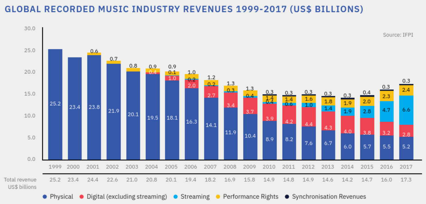 从黑胶唱片到磁带到CD,音乐可得性越来越强。再到MP3、iPod,互联网的出现使得数字音乐普及,传播媒介的变化带动整个音乐产业变化。但数字音乐普及的过程中,版权问题一度造成整个录制音乐产业萎缩。数字音乐快速挤占实体音乐份额,但又迟迟不能找到理想的商业模式。